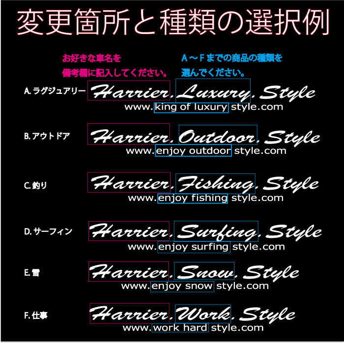 この商品は 【110cm】車名入りブラッシュ筆記体文字ステッカー【車名文字変更無料】カラー17色/オリジナル作成/車 ステッカー/防水/オーダー/車用/カッティングシール/フィッシング/サーフィン/仕事/釣り/雪/スノボー/アウトドア/かっこいい/サーフ/海用/サーファー/ハイエース/ ポイント ハイエースから車種部分文字変更無料!A ラグジュアリーB アウトドアC フィッシングD サーフィンE 雪 F 仕事選べます! 横110cmの大きめサイズのカッティングステッカー!! ◇サイズ 横110×縦14cm◇カラー 1.ブラック 2.ブラック(マット) 3.ブラウン 4.ホワイト 5.アイボリー 6.イエロー 7.さくらピンク 8.ラズベリー 9.レッド 10.アクアブルー 11.ブルー 12.エメラルドグリーン 13.フォレストグリーン 14.パープル 15.オレンジ 16.ゴールド 17.シルバー◇商品の種類A ラグジュアリーB アウトドアC フィッシングD サーフィンE 雪 F 仕事◇素材 ソフト塩ビシート 文字だけが残るカッティングステッカー 使用メーカー 3M 屋外耐候性4年〜5年(メーカー参考データ) 【車名変更無料】 車名部分は他の車名や文字に変更可能注文時に記入欄にご記入下さい。
