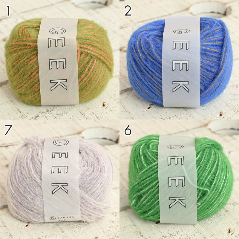 商品名 ダルマ ギーク 品質 ウール 56% ポリエステル 30% アルパカ 14% 重さ・糸長 30g玉 約70m 参考使用針 棒針:12~13号 かぎ針:9/0~10/0号 標準ゲージ 棒針(メリヤス編) 13~13.5目 19~20段 標準使用量 レディースベスト 5~6玉 レディースプルオーバー 8~9玉 ・糸の芯と吹き出しているウール繊維の色を変えた、ユニークな糸です。
