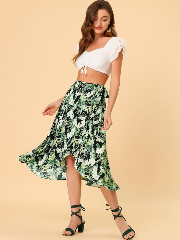 ソウテン Allegra K 花柄 トロピカル ハワイアン ミディスカート ラップスカート レディース ブラック M